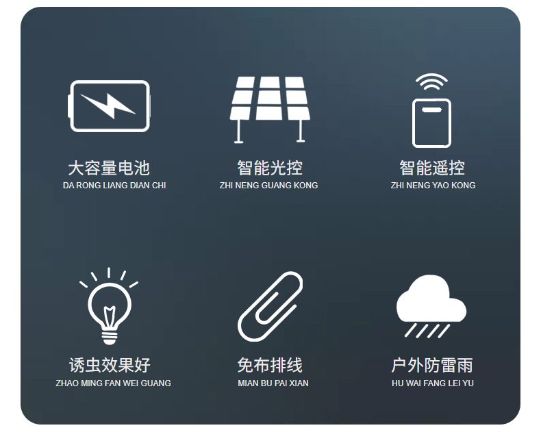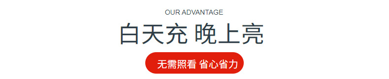阴天:天黑自动工作,白天自动关闭,自动充电。